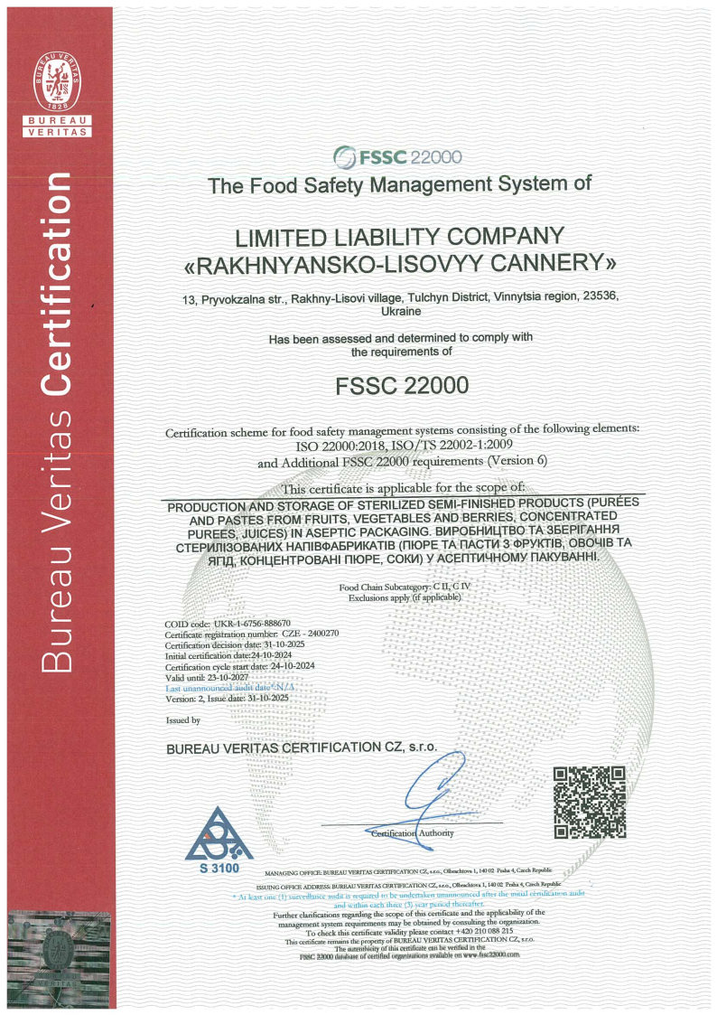 Рахнянсько-Лісовий консервний завод успішно пройшов сертифікацію за міжнародним стандартом FSSC 22000, що підтверджує відповідність системи управління безпечністю харчових продуктів найвищим міжнародним вимогам.